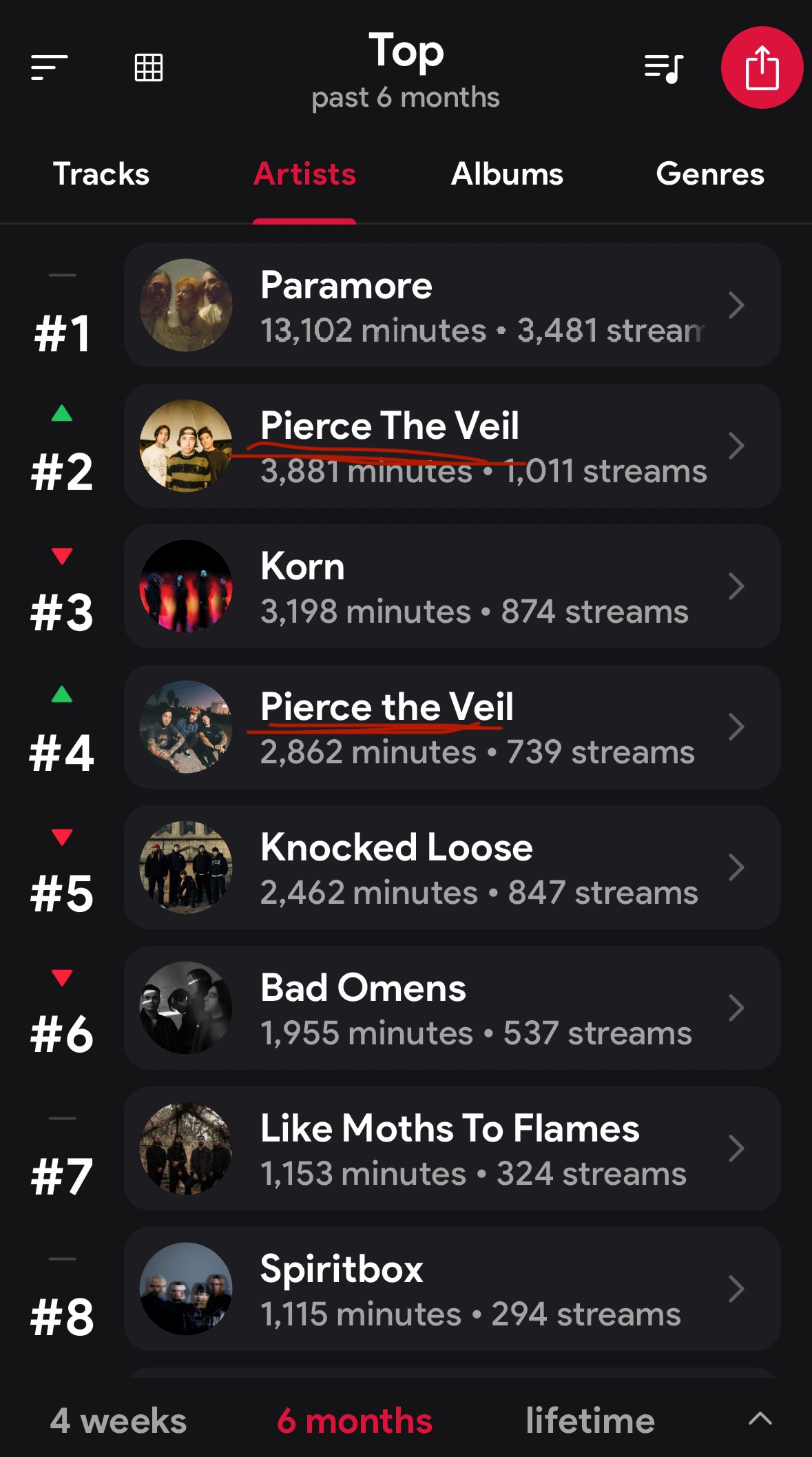 Pierce the veil shows up twice under my top artists. It is not just under 6 months it’s under every category. It would be great if you could fix this.