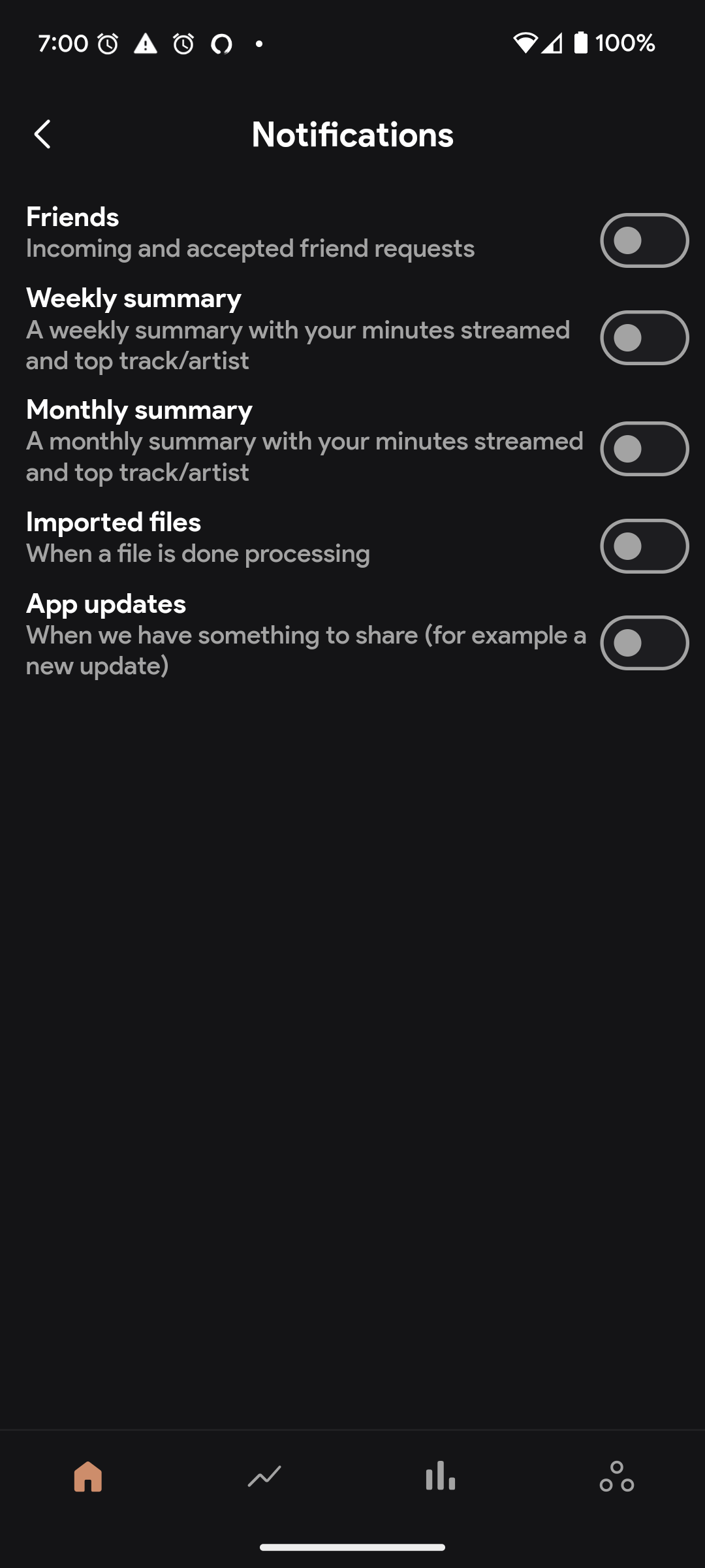 I have all of my notifications turned off in the settings, but I'm still getting regular notifications from the app (such as the “weekly recap”. I'll attach a screenshot of my notifications page in the settings.
