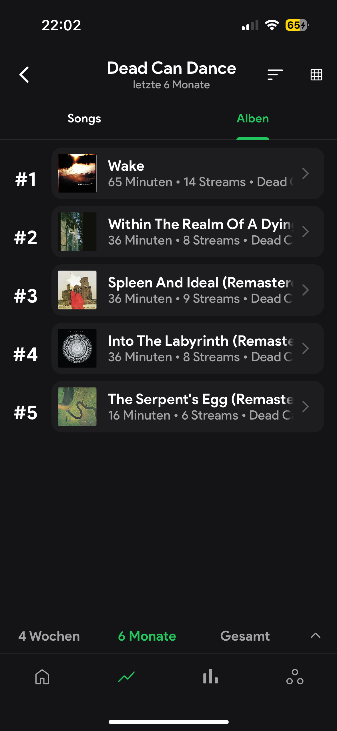 ngehört. Dennoch taucht es in der sechs Monatsstatistik auf Platz 1 der meist gehörten Alben dieser Band auf mit 14 Streams.