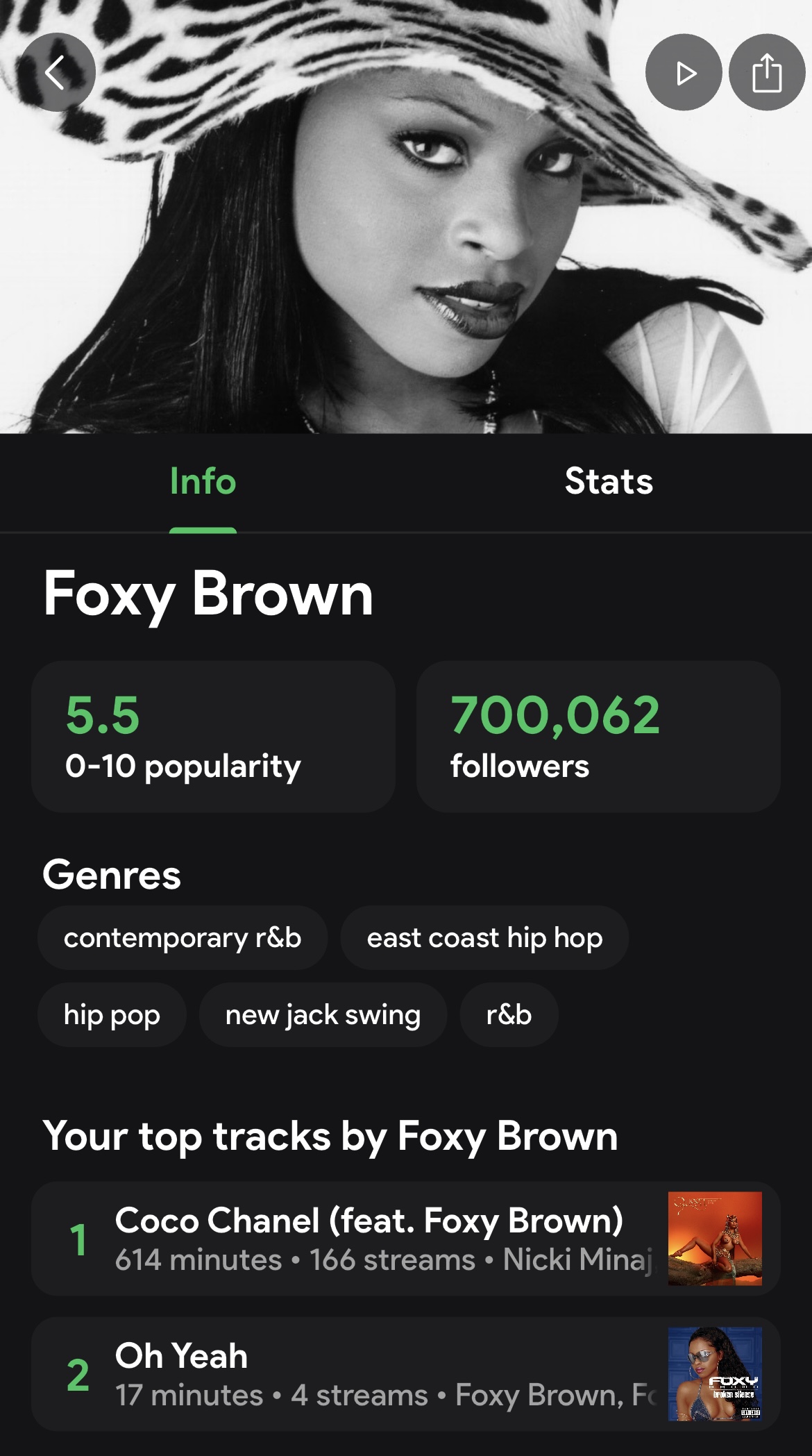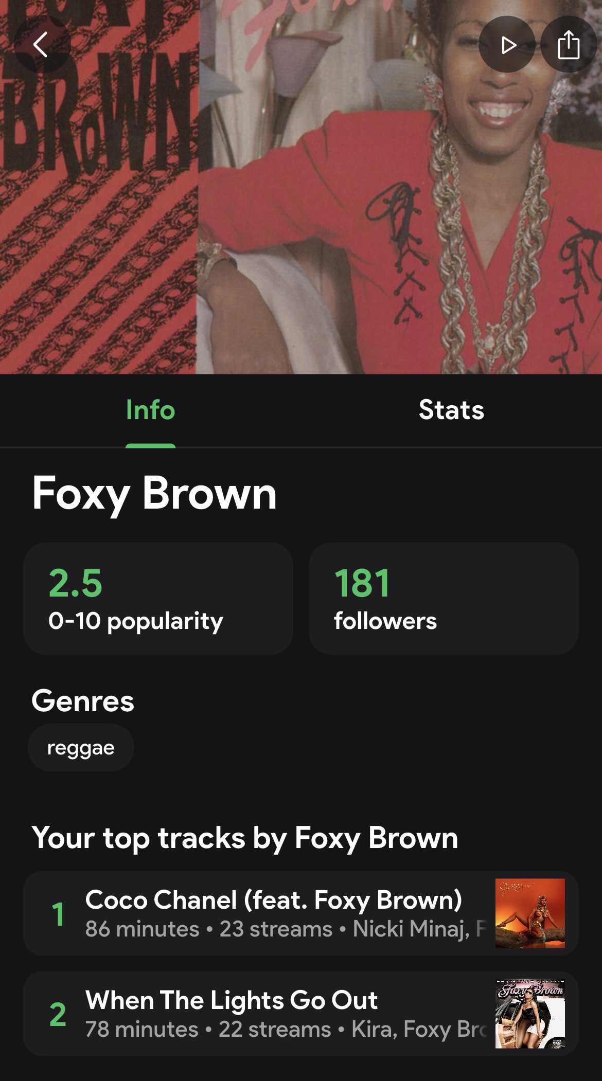 foxy brown (reggae singer) and foxy brown (rapper) seem to have their stats merged together, with some of the rapper’s songs only appearing under the reggae artist’s name?