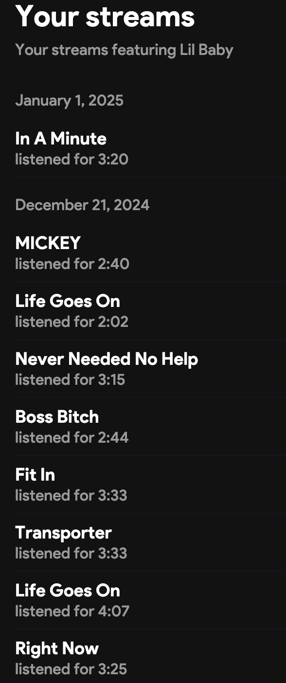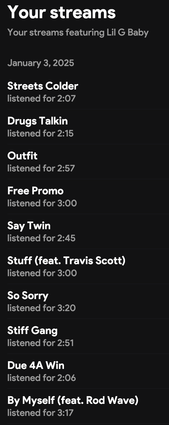 Some streams for Lil Baby show up under an artist called “Lil G Baby.” Streams of Lil Baby’s new album WHAM is showing up under this artist rather than Lil Baby’s.