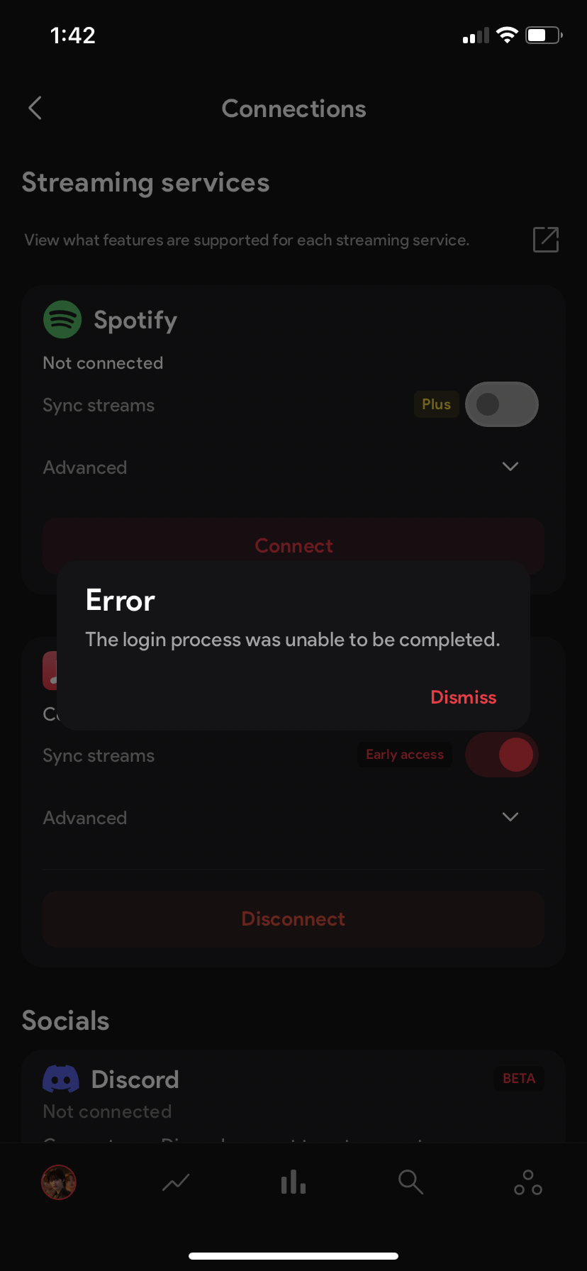 for my connections, i can connect with Apple Music but i cannot login with Spotify account. I keep getting error.