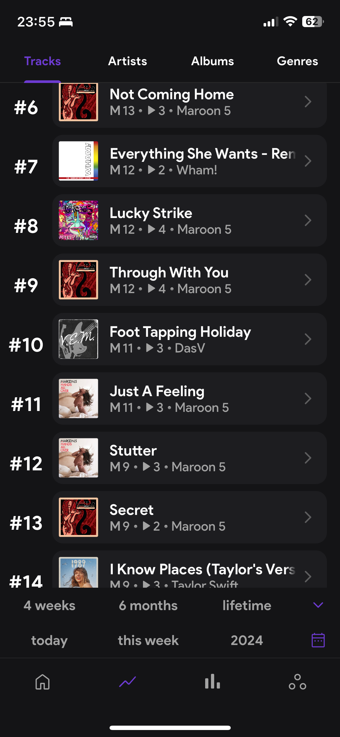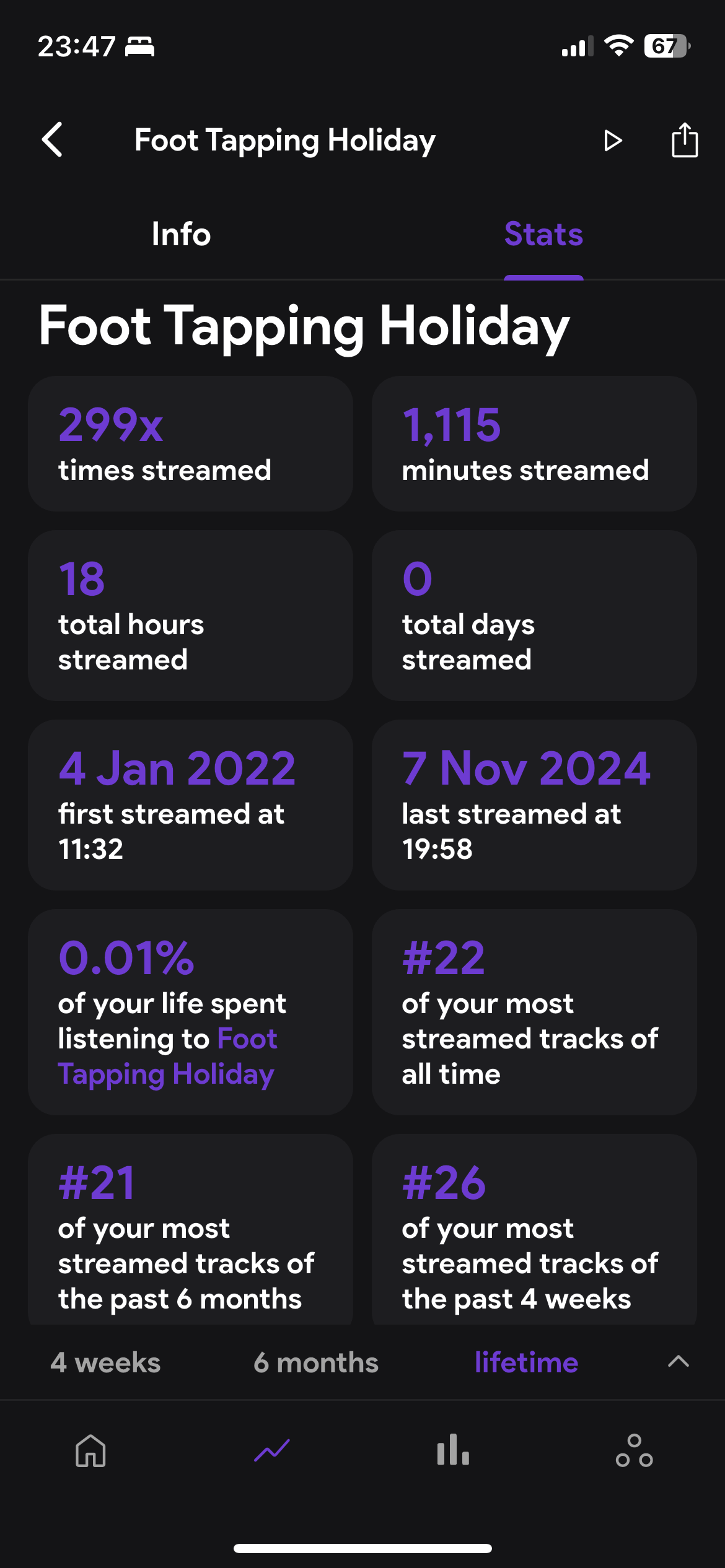 hi, i’ve been making a playlist throughout 2024 which documents the songs that I stream the most each day and so for this I use this app and look through the streams each day to see which one has been streamed the most. however I’ve come across a random song and I clicked on it and it said that I’ve been streaming it since 2022 and that I’ve streamed 150 odd times this year and I know for a fact that I’ve never listened to that song bc it’s just some weird random instrumental. but it seems to have showed up quite regularly in my daily streams so I was just wondering if maybe it’s a glitch and it’s meant to be another song but it’s combined into that one, as the total streaming history of it looks like it’s for my other fave songs. i’ve attached screenshots so you can see what i mean, as i know i haven’t ever listened to that song, especially not 150-odd times this year or 3 times in one day. and i know it definitely shouldn’t be my 22nd most streamed song of all time LMAO and no one shares my spotify account so im confused.