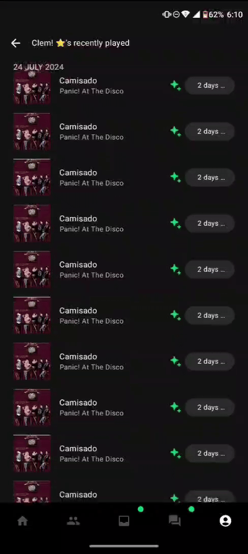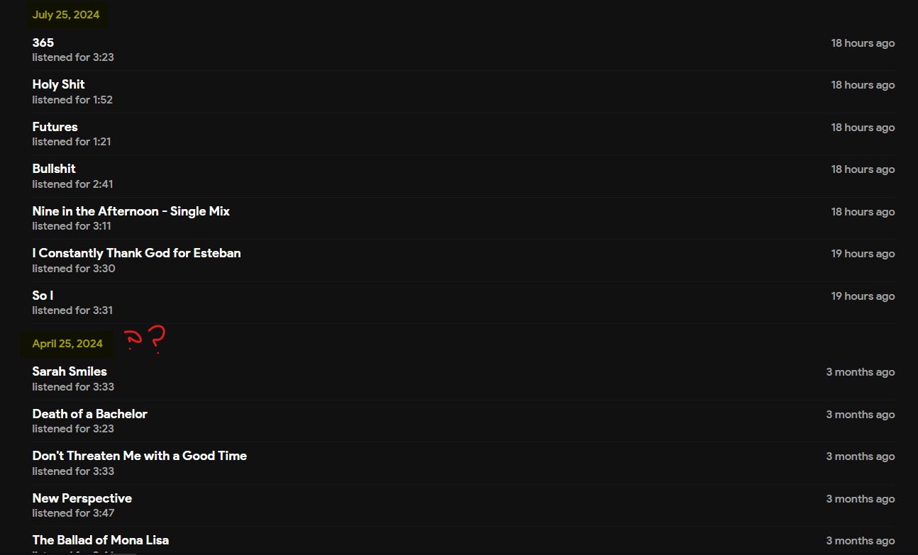 i re-got stats.fm plus yesterday and almost all my streaming dat is messed up, huge jumps and I looped a song for a whole day like three days ago and its telling me i have never once in my entire life listened to this song while airbuds is showing that i listened to the song for over 12 hours so ?? i went through everything and my sync is turned on, i donβt have offline mode turned on on spotify the only thing i can assume is that my computer will often log me out of stats.fm and it will take me a couple days before i realize i need to relog back in so maybe it stops logging my information when that happens? i just logged out of it entirely on computer rn